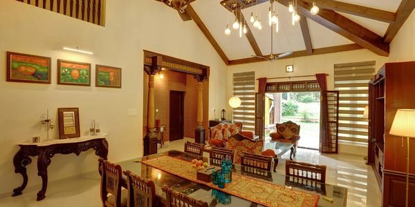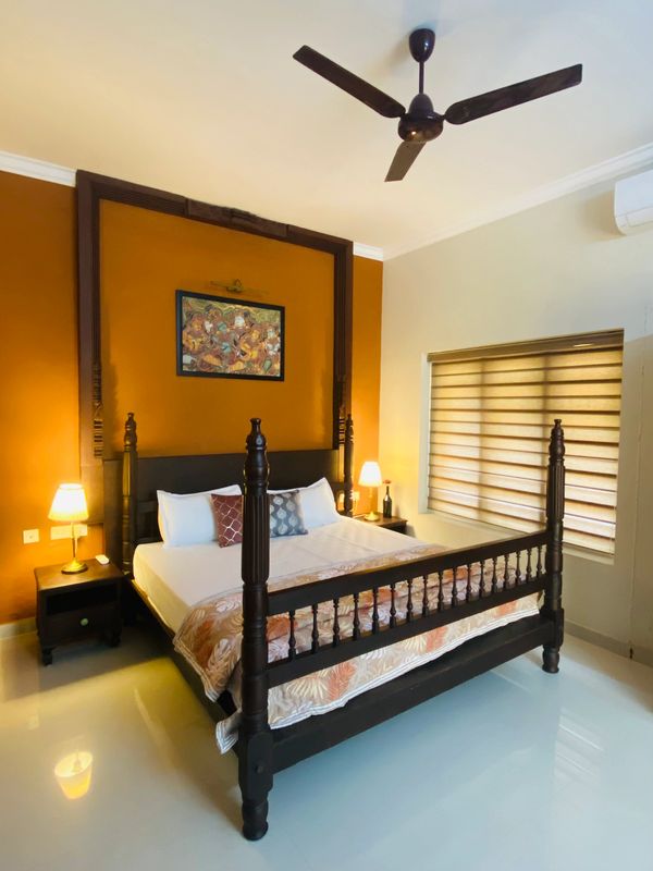 The spacious master bedroom is located on the ground floor and opens into a private patio designed for complete seclusion. This suite is furnished with a king size bed, heritage wooden furniture, carved details, and curated antique elements sourced from different parts of India.